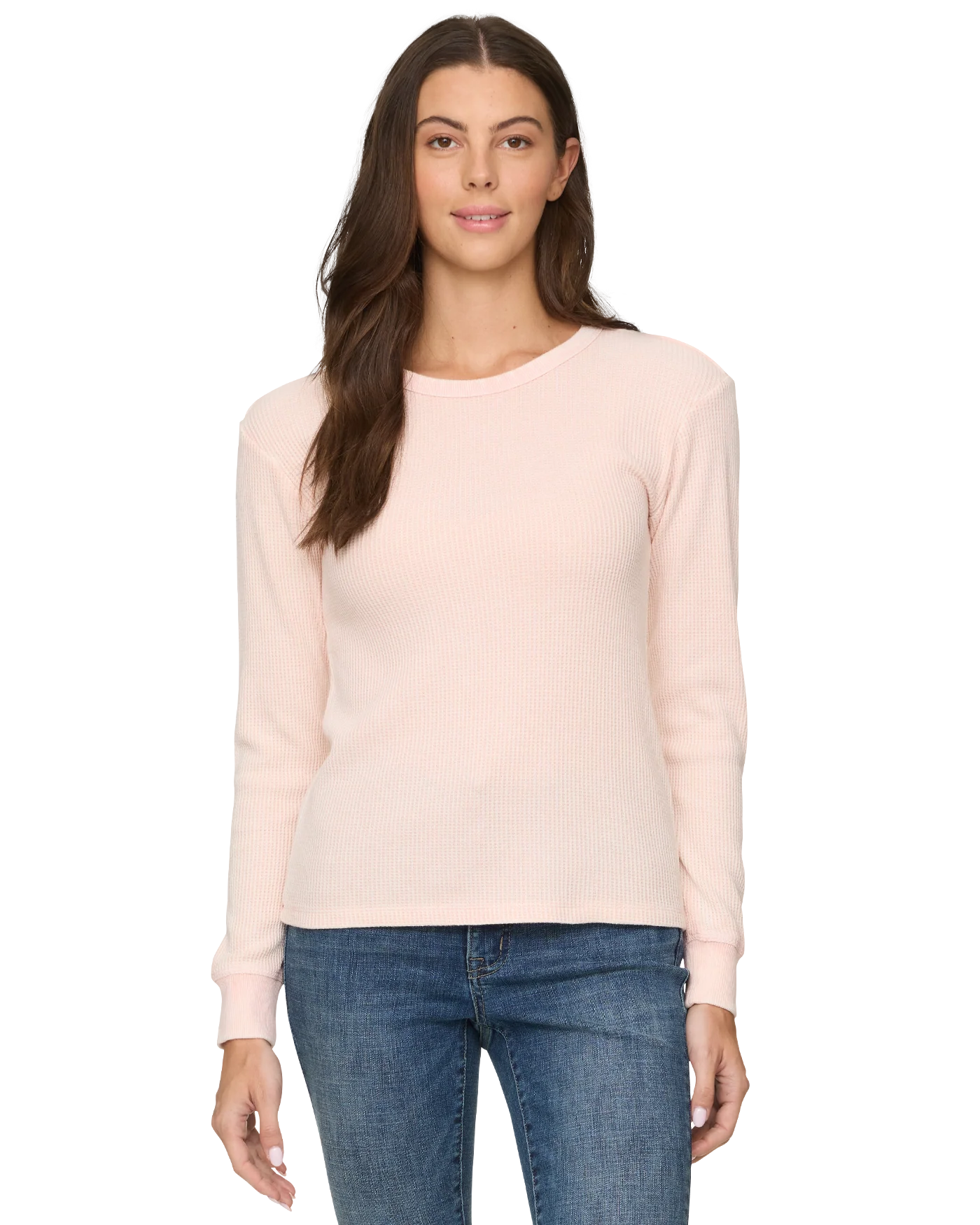 Woman wearing a pink ribbed long-sleeve top and blue jeans on a white background
